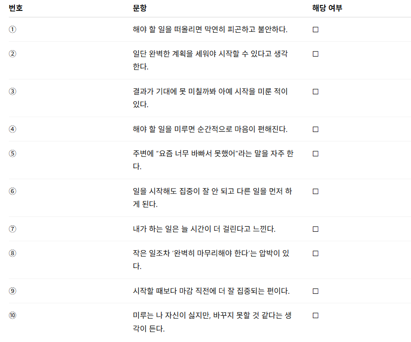 결국 미루기의 본질은 게으름이 아니라 _두려움과 피로의 합작품_입니다.